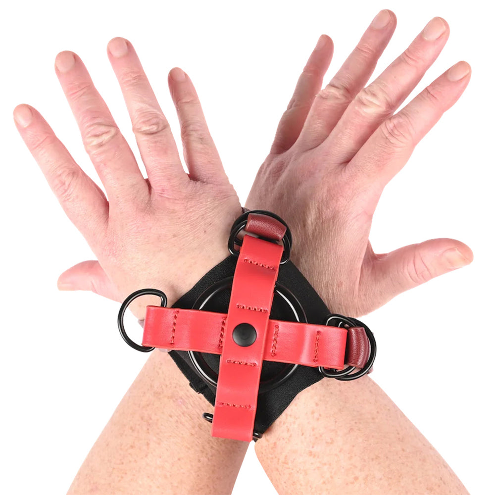 Attached in the middle, the Cross Wrist Cuffs' stretchy black bands hold tight over each wrist. Buckle the vegan leather straps to add security and snugness—a sturdy metal O-ring keeps everything together. Play on!