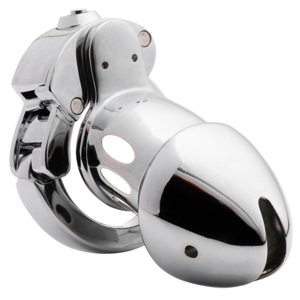 This nearly solid (there's a pee-hole and some air vents) aluminum Cage fully restrains their shaft and tip. You'll lock it up tight to the adjustable snap-lock base ring before letting them say bye-bye (if you feel generous) to the cock you now own.