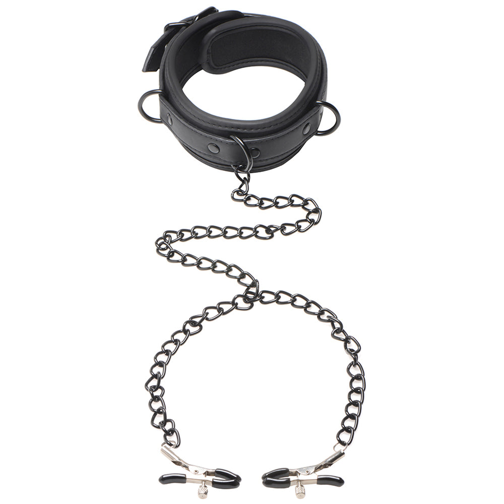 Want to keep 'em under full (consensual!) control, ready and waiting in sexy anticipation? Have we got the tool for you! This perfect playtime combo from Master Series pairs two classic staples - a pair of adjustable nipple clamps and a no-nonsense collar.