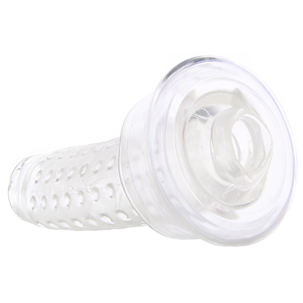 Highly textured inside and showing off an eager mouth outside, this crystal clear sleeve slips into the opening of most standard pump cylinders (up to 4"/10.25cm diameter)for that sturdy outside/soft inside sensation you love. Once past the clingy lips, you'll enter a nice snug chamber lined with vertical rows of massaging nubs. What better way to make use of a newly pumped penis!?